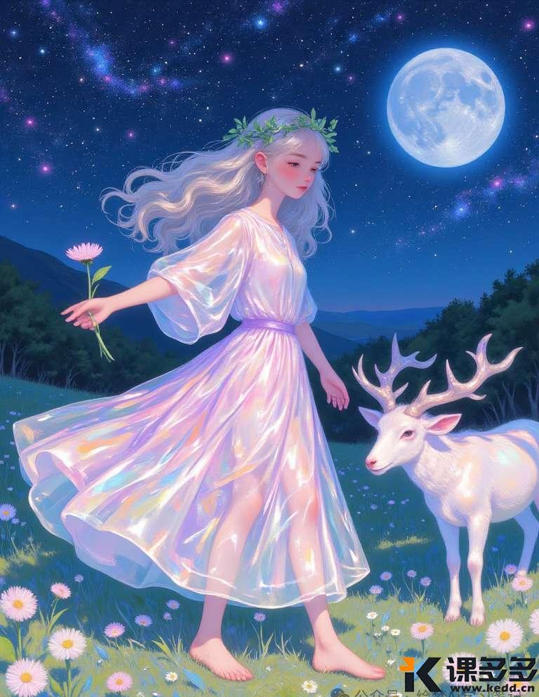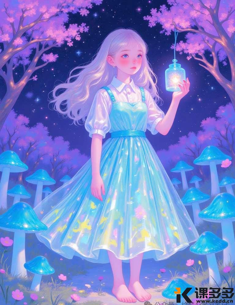 提示词:戴毛绒耳罩的牧羊少女跪坐冰原,水晶牧杖插入地面引发环形荧光脉冲。极光帷幕下,冰晶羊群啃食的荧光地衣呈现故障艺术光效,少女斗篷内衬流动着银河荧光刺绣。空中悬浮的菱形冰晶折射七彩光斑,冰层裂缝中升腾的荧光雾气凝结成半透明光蝶。