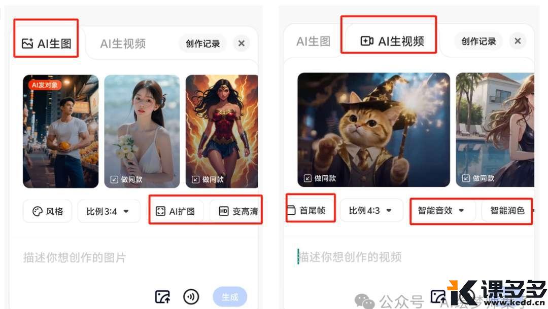 手机APP端进入首页后,点击AI生图。AI生视频的功能就在AI生图旁边。