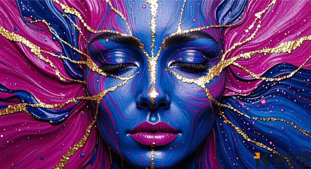 丙烯颜料泼洒形成的抽象人脸,紫红色与靛蓝色漩涡交织,金色线条撕裂画面中央,杰克逊·波洛克行动绘画风格,厚重笔触与滴溅痕迹,亚麻布纹理基底
