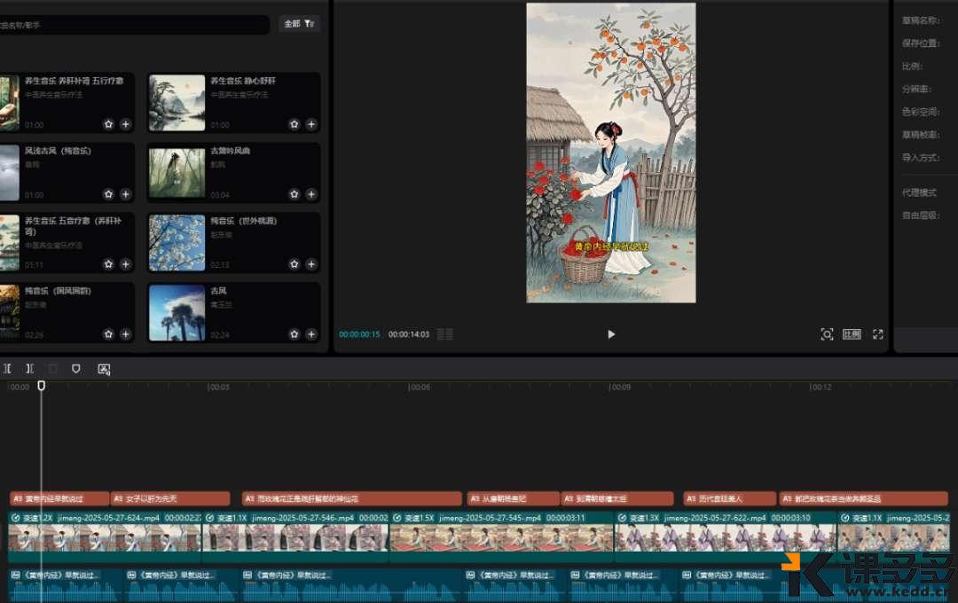 1.中国古代水墨画风格,一位身着汉服的女子在农家小院中采摘玫瑰花,竹篮中盛满新鲜花瓣,远处是茅草屋和篱笆,柿子树随风轻摇。