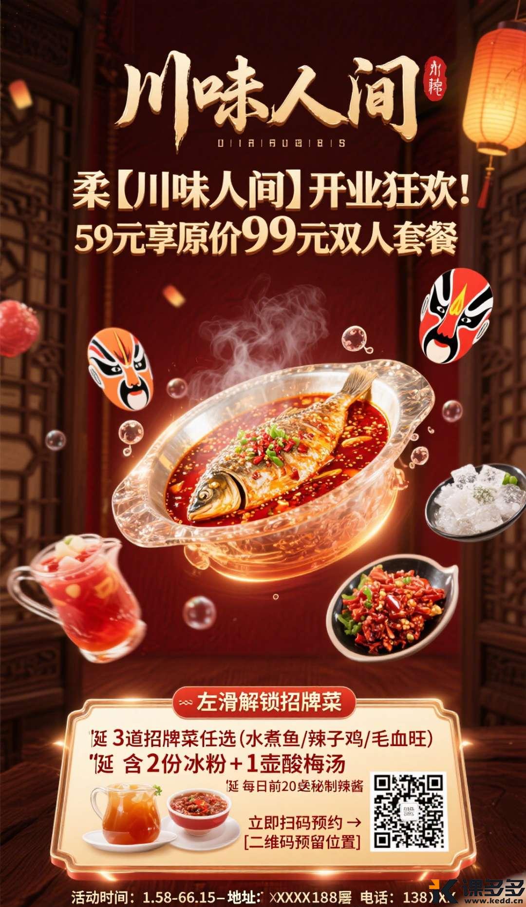 请生成一张高质感饭店促销海报,要求如下:主题与目标突出“新店开业·限时优惠”核心信息,营造热闹温馨的就餐氛围,吸引顾客立即到店文案内容主标题:🔥【川味人间】开业狂欢!59元享原价99元双人套餐副标题:← 左滑解锁招牌菜(加粗)优惠点:✓ 3道招牌菜任选(水煮鱼/辣子鸡/毛血旺)✓ 含2份冰粉+1壶酸梅汤✓ 每日前20桌送秘制辣酱行动号召:立即扫码预约 → [二维码预留位置]底部备注:活动时间:5.28-6.15 | 地址:XX路188号 | 电话:138XXXX8888视觉要求1.风格:现代中式美学,深红+鎏金主色调,搭配木质纹理背景2.菜品图:居中展示晶莹透亮的水煮鱼特写(红油浇淋动态效果),周围环绕小图:冒泡酸梅汤/红油辣子鸡/雪花冰粉3.构图:顶部:艺术书法店名“川味人间”+灯笼元素中部:菜品组合悬浮展示(带蒸汽热效)底部:优惠信息立体卡片设计(边缘光效)4.质感:金属立体字标题辣椒碎粒飘散动态背景若隐若现的川剧脸谱暗纹技术参数比例:9:16竖版(适配手机展示)分辨率:4K超清避免:文字过密/颜色超过4种/真人模特