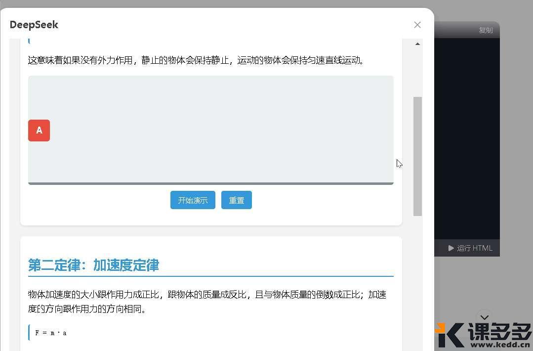 DeepSeek 开始干活,开始写代码,写完后点击源代码框右下角的“运行 HTML”就可以了